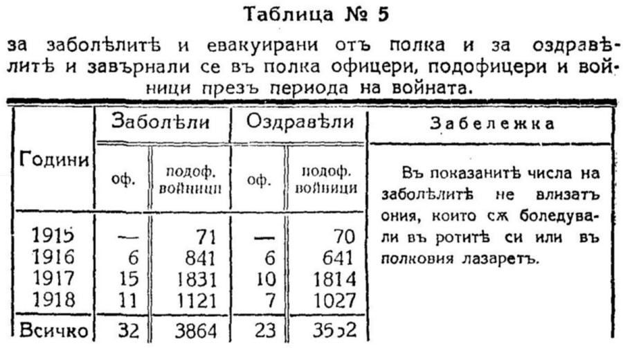 Въ таблица № 5 се виждатъ дълги колони отъ заболѣли отправени по етапенъ редъ къмъ разнитѣ болници разположени назадъ отъ полка. По-голѣмата часть отъ заболѣлитѣ сѫ отъ слабость, изтощение и малария. Тукъ не трѣбва да се забравя, че полкътъ бѣ комплектуванъ отъ запасни войници отъ по-старитѣ набори — между 30 и 40 годишна възрасть, смѣтани въ началото на войната.