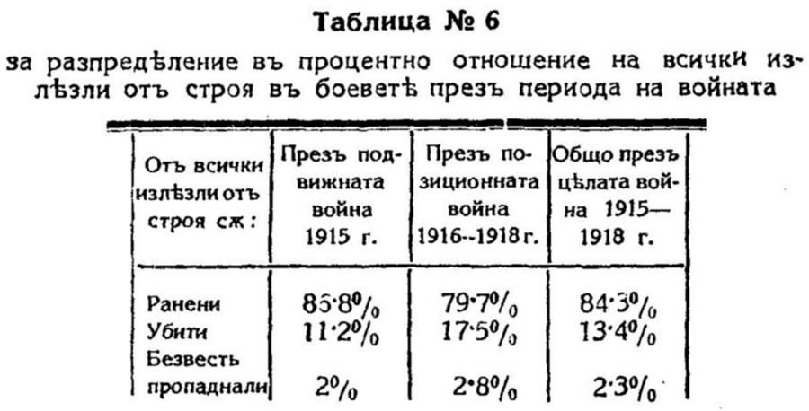 Отъ сѫщата таблица се вижда отдѣлно това съотношение както презъ подвижната война срещу Сърбия презъ 1915 г., така и презъ позиционната война презъ 1916—1918 г.