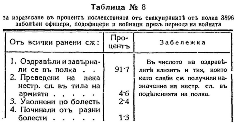 Въ сѫщата таблица е проследенъ и по нататъшниятъ пѫть на раненитѣ. Отъ нея се вижда, че по-голѣмата часть отъ раненитѣ сѫ оздравѣли напълно и сѫ се завърнали въ полка ; друга часть сѫ оздравѣли, но сѫ останали съ нѣкои недостатъци и затова сѫ преведени отъ полка въ разни части и учреждения на нестроева служба въ тила на армията ; друга по-малка часть сѫ сѫщо оздравѣли, но сѫ останали съ по-голѣми недостатъци и сѫ уволнени отъ военна служба като инвалиди; най-сетне се вижда и каква часть отъ раненитѣ сѫ починали вследствие ранитѣ си.