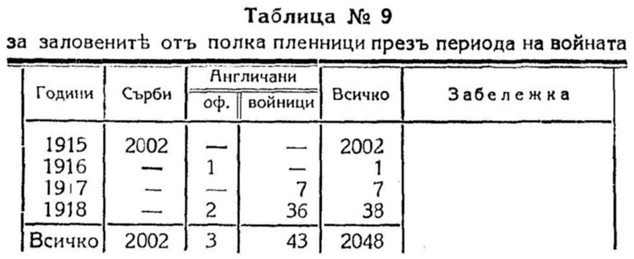 Въ таблица № 9 сѫ показани заловенитѣ отъ полка пленници, показани по народность, презъ периода на цѣлата война.