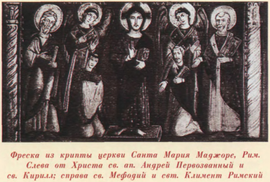5. Фреска из крипты церкви Санта Мария Маджоре, Рим. Слева от Христа св. aп. Андрей Первозванный и св. Кирилл; справа св. Мефодий и свт. Климент Римский