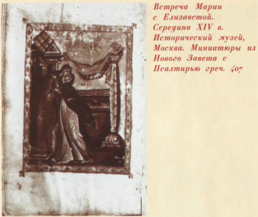 28. Встреча Марии с Елизаветой. Середина XIV в. Исторический музей, Москва. Миниатюры из Нового Завета с Псалтирью греч. 407
