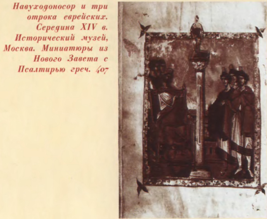 30. Навуходоносор и три отрока еврейских. Середина XIV в. Исторический музеи, Москва. Миниатюры из Нового Завета с Псалтирью греч. 407