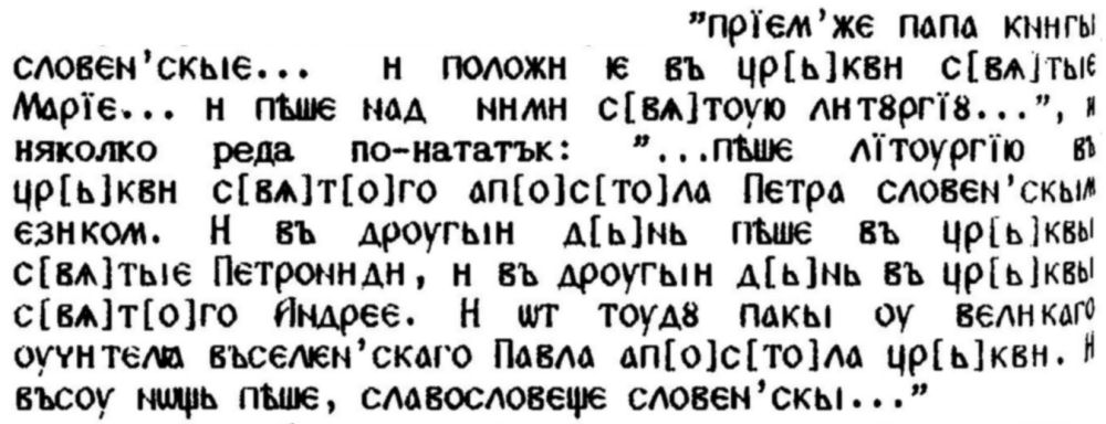 Въпреки мнението на някои слависти първата религиозна употреба на славянския език (схващан през IX в. като единна езикова същност) е свързана с типични за латинското християнство тенденции — факт, който може да се документира. Остарялата, но все още поддържана