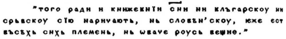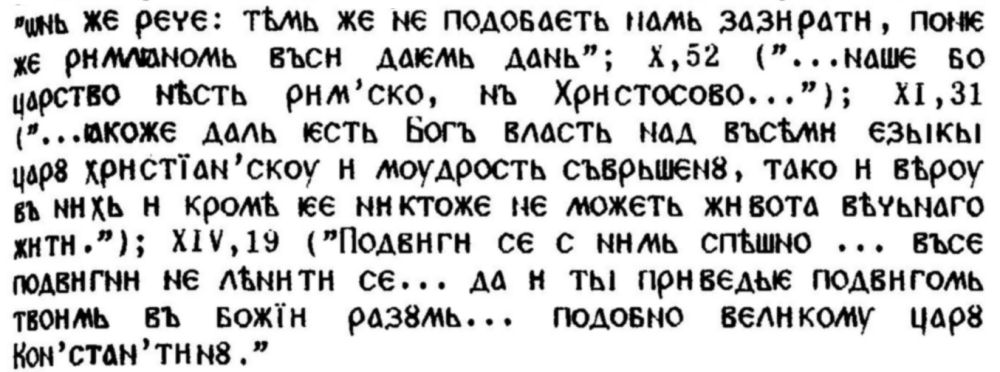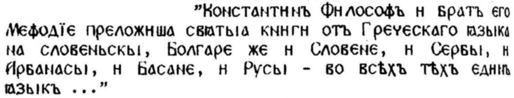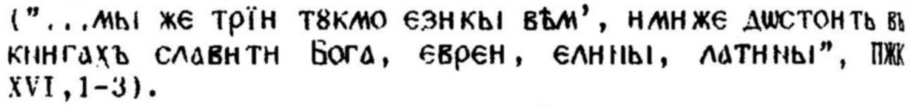 177. Срв. Лавров, П. А. Цит. съч., с. 172. Значението на ı-азыкъ е недвусмислено, що се отнася до ʺгръцки езикʺ. Във втория случай вече се намираме пред по-сложно значение — език-народ: но езиковата общност, утвърдена на нивото на религиозен църковно-славянски език, е тази, която поддържа понятието (второстепенно и производно) за национална славянска общност.