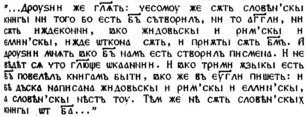 най-ранния въпрос за езика у славяните наистина ще бъдат много добре схванати и оценени, ако се изходи от общата езикова традиция на християнския свят, не като се позоваваме на идейни постановки и практически отношения, формирали се в периода, обхващащ времето на държавно-политическата реорганизация на Запад, от страна на Карл Велики до схизмата на Михаил Керуларий и разпростирането на източното християнство в земите на Киевска Рус. Резултатите от един дори повърхностен преглед на християнската традиция през предшестващите седем века предлагат достатъчно данни, за да се изключи (поне според мене) всякаква възможност за вписване на проблема в границите на отношенията между латинско-германския Запад и византийския Изток според идейно-политическите схеми на посткаролингска Европа.