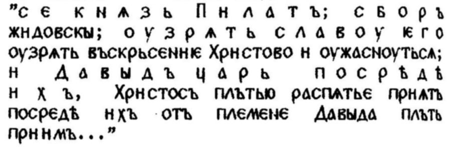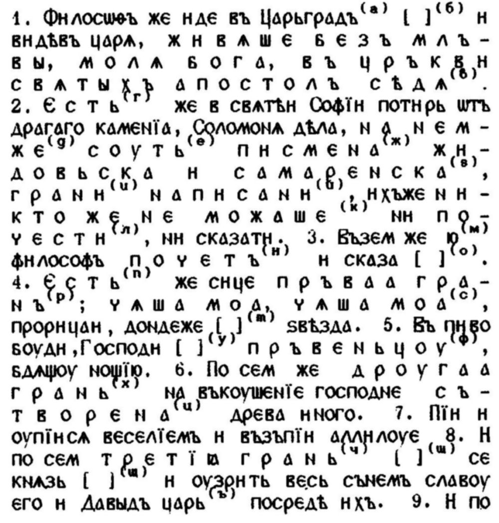 на драгоценной чаше Соломоновой европейскими и самарейскими писмены, ихже не можеть ни кто же истолковати "развѣ единъ философъ иже вѣ приходилъ оучити великаго кнѧза Владимира". Срв. също Ангелов—Кодов. Цит. съч., с. 54.