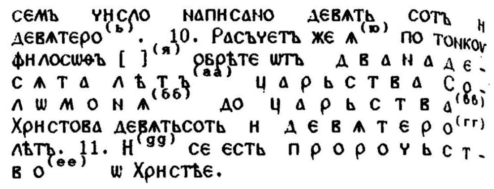 Единственото съществено разночетене (ь) в деветото изречение потвърждава, че някои преписвани тълкователи, сблъсквайки се с този вид цифров символизъм, Окончателно са се объркали и са реагирали на засвидетелствания в преписа-извод или в преписите-изводи