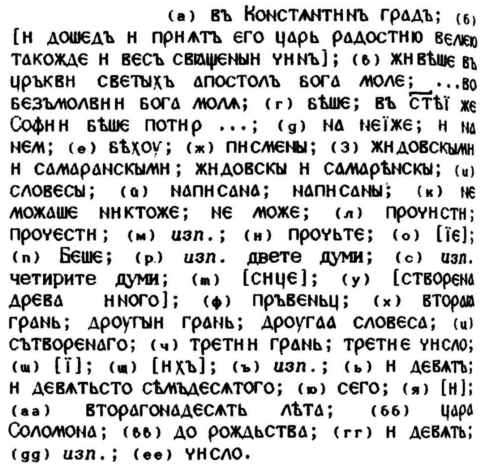 Несъмнено приведеният списък от разночетения, извлечени от частичната, а понякога и противоречива информация, предложена в различните дипломатически издания на преписите, е неизползваем в рамките на едно модерно изследване на ръкописната традиция. В него не е уточнено в кой именно препис (или група преписи) е засвидетелствано дадено четене. А пък и самата информация относно разночетенията е полезна само ако се основава на цялостна съпоставка на всички известни преписи [16]. Независимо от това, що се отнася до конкретните