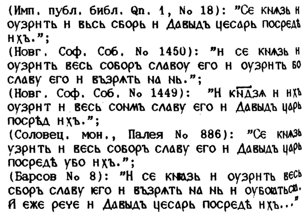"Се кнѧзь (разн.: пр. ихъ) и оузрить весь сънемъ славоу его и Давыдъ царь (разн.: изп. царь) посредѣ ихь.”