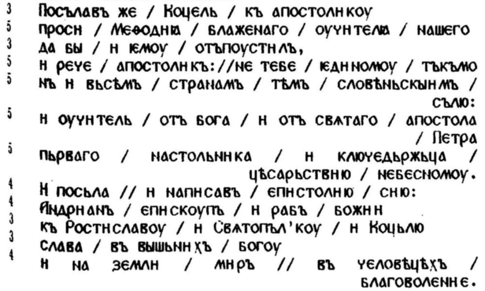 Даже и когато повествованието не е риторично напълно издържано и когато основната ритмична структура е трябвало да се нагоди към техниката на цитирането (ограничавайки свободата на писателя-компилатор), присъствието на даден вид изокòлни серии, които твърде бързо са били стандартизирани от традицията, е позволявало на четеца да "рецитира” текста, извличайки интерпретацията от правилното сегментиране на ритмичните единици. Показателно в този смисъл е например началото на глава осма от Пространното житие на Методий, в която е цитирано едно прочуто (но с твърде съмнителна автентичност) папско послание: