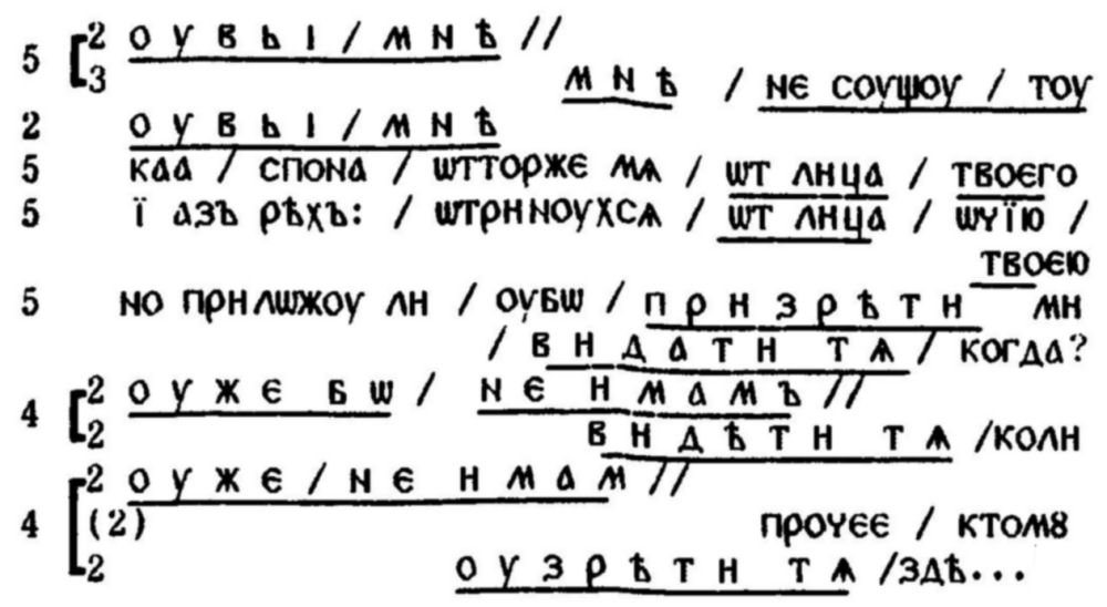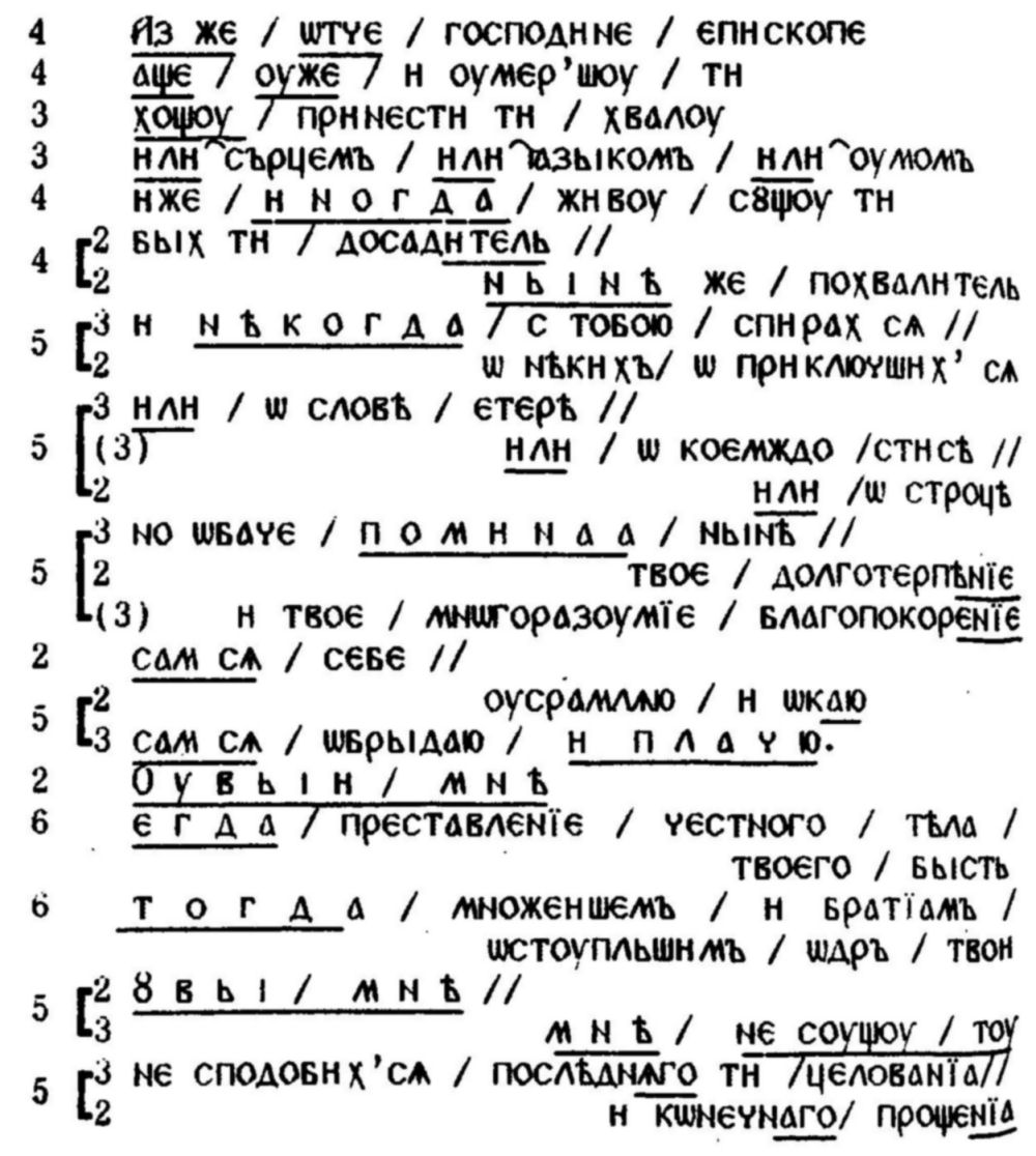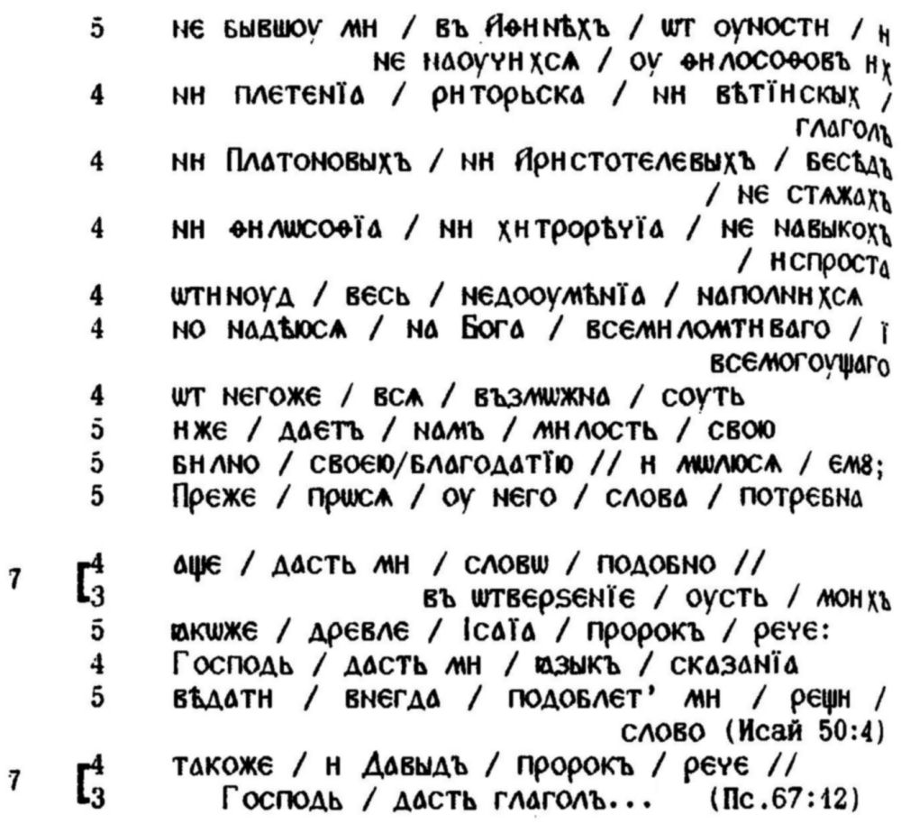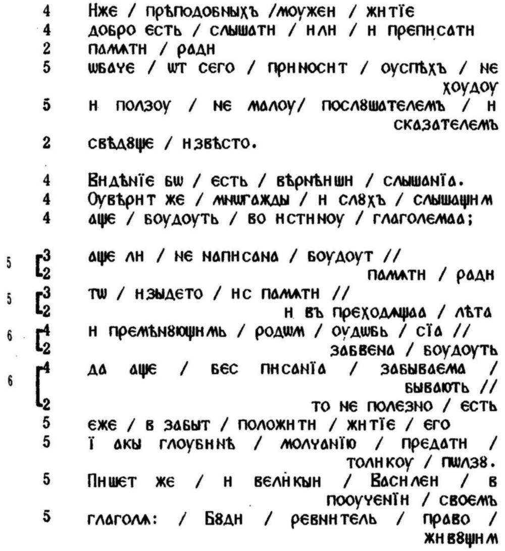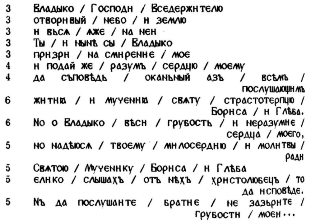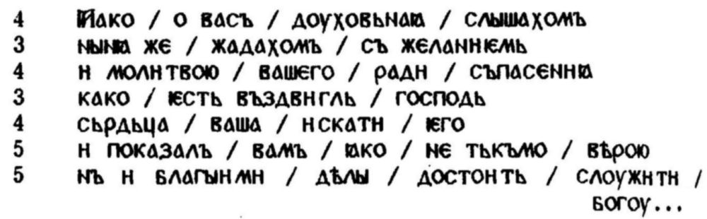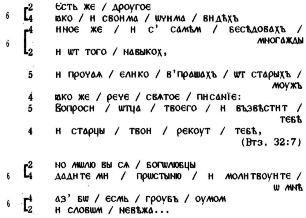 И на самото придържане към скандирането, което са предлагали добре познатите ритмични модели, е подпомагало правилното четене-интерпретация на онези по-сложни риторични формули, които (още в самото начало на християнската традиция в Киевска Рус) славянските творци са възприели от византийската омилетика, стремейки се да превърнат синтактичните сложности в серии от ритмично-логични сегменти. "Ритмичният ключ” прави много по-понятно например встъплението на "Чтение о святых мучениках Борисе и Глебе” от Нестор: