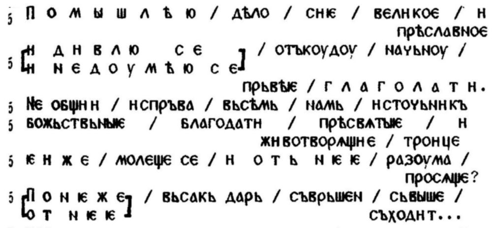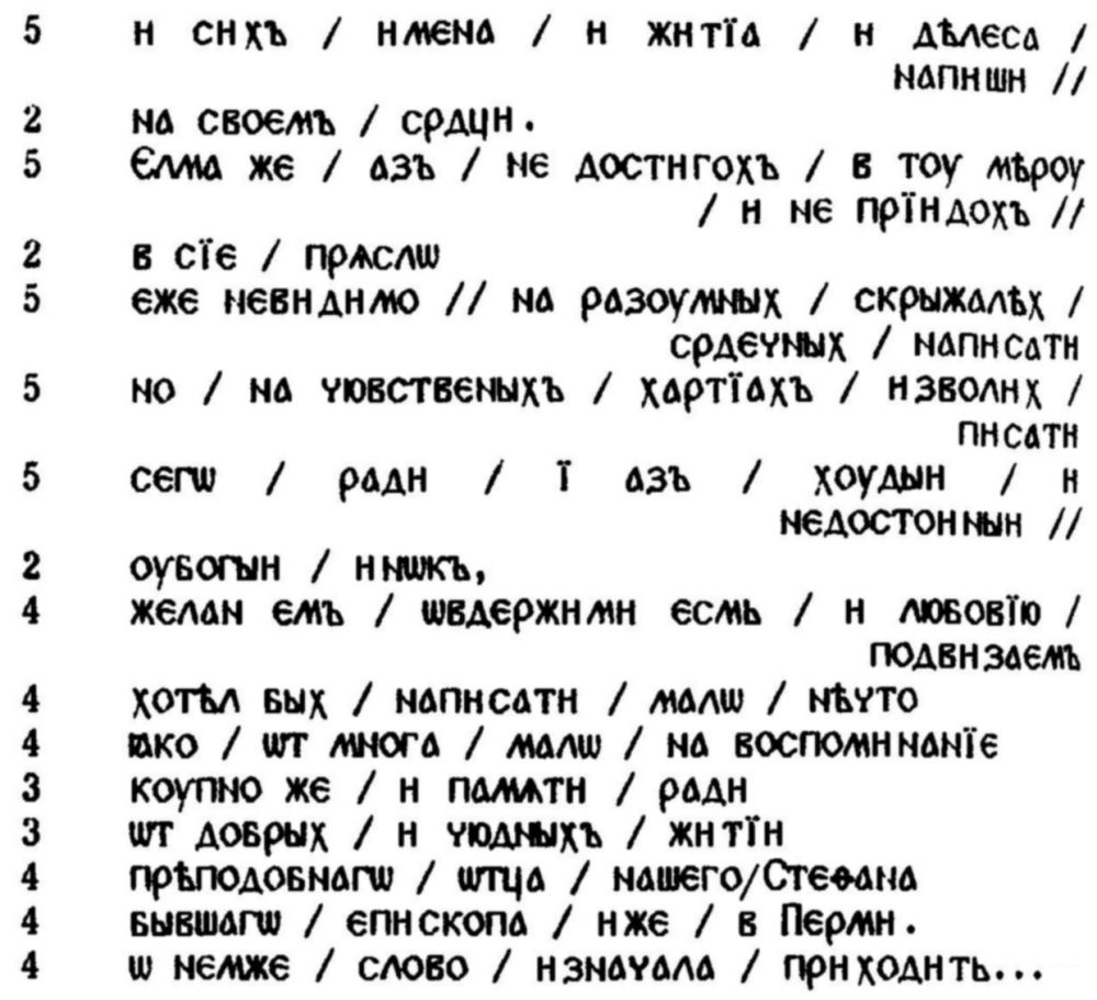 влияние. Споменахме вече името на Епифаний Премъдри (починал през 1420 г.), представител на поколението, все още близко до това на Евтимий Търновски. Една негова агиографска творба — Житие св. Стефана Епископа Пермского [27], заслужава по-специално внимание не само поради присъщите ѝ стилистични характеристики, но и защото именно в това съчинение Епифаний говори за ʺплетенїе глаголъ”; тази формула, както се каза, се радва на особен успех в нашата епоха. Уместно е тук да се приведе в ритмично четене един обширен цитат от встъплението на това Житие: