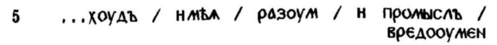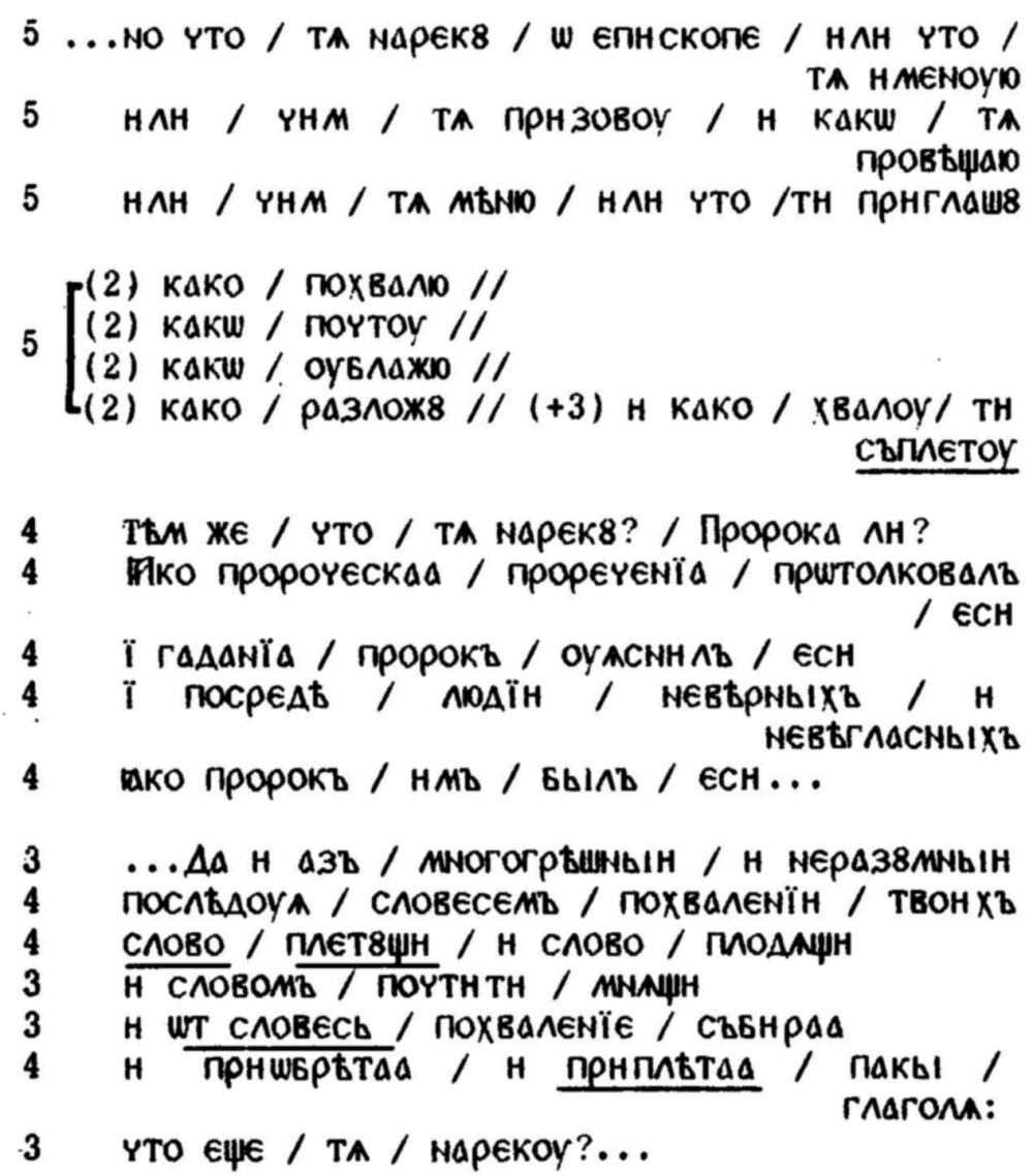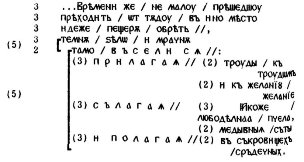 че първият подчинен кòлон ı-акоже / любодѣлнаа / пчела е вметнат. И това подчертаване е подсказано както от същността, така и от самостоятелността, които този кòлон / вметнат израз придобива благодарение на своите три ударения: затова няма нужда да се включва в ритмичното течение, породено от сълагаѧ; напротив, изисква две паузи — преди ı-акоже и след пчела, — които улесняват връзката между сълагаѧ и медывныѧ съты. Тази семантично-ритмична игра е подчертана отново и завършена от последния кòлон на вътрешната серия, управлявана от деепричастията. След новия "регулярен” трикòлон с три ударения същият начин на четене трябва да се приложи към последните кòлони, управлявани съответно от приде и труждьсѧ и завършени от глаголната форма възможе ...обрѣсти, която се свързва също и с логичния паралелизъм на началния управляващ глагол: въселисѧ... възможе... обрѣсти.