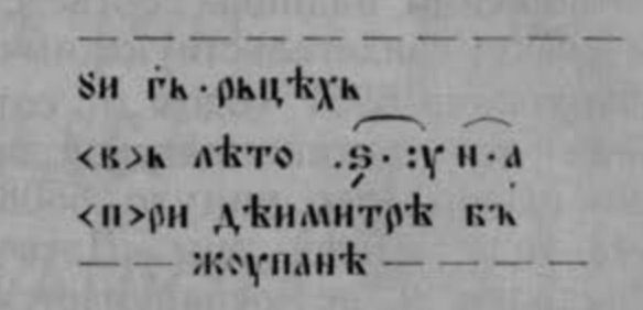 Буквы — цифры составленные из ѕ, у, н, л указаны титлами. ѕ имеет спереди внизу на строке точку, под ней находятся две маленькие косые линии, обозначающие число тысяч буквы-цифры; вверху, в правой части, также находятся две точки, вертикально расположенные. И тоже в правой части находится третья точка, расположенная посередине строки. Между буквами-цифрами низ также находится точка посередине строки, а под а находится одна точка.