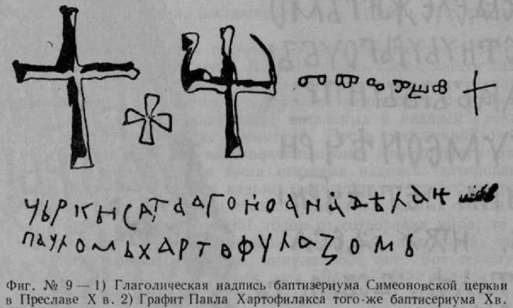 Фиг. № 9 —1) Глаголическая надпись баптизериума Симеоновской церкви в Преславе X в. 2) Графит Павла Хартофилакса того-же баптисериума Х в.