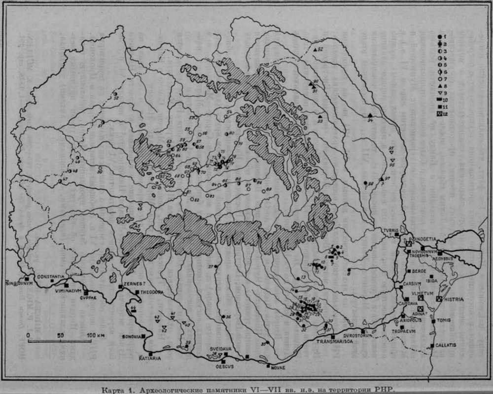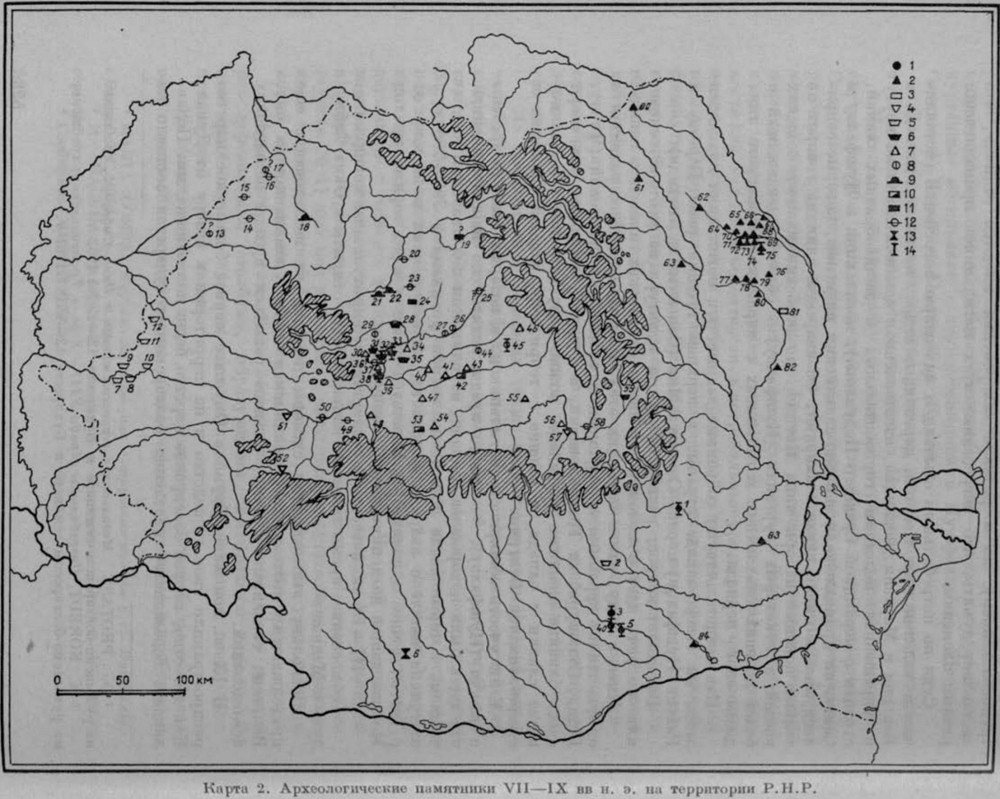 Подробно изучив все эти данные, мы пришли к выводу, что в IX—X вв. на территории нашей страны различались две группы комплексов. Первая группа этих памятников распространена в Добрудже и в Румынской равнине. Население этой группы — смешанное, состоящее из прарумынского, славянского и кое-где (например некоторые погребения из могильников у с. Метрик и Султаны) праболгарское. Вторая группа включает памятники типа Буков. Она распространилась особенно в горном и подгорном районе Южных Карпат. В этой группе преобладает прарумынское население, но на нем чувствуется славяноболгарское влияние из-за тесных экономических и культурных связей двух этнических групп [3]. В Трансильвании, наряду с местным многочисленным (романским) и славянским населением, жили небольшими группами и моравские славяне, археологически известные по среднему течению Муреша, где были вскрыты некрополи (Чумбруд) или погребения (Тэртэрия, Попади Ноуэ) типа Старо Место. К ним можно добавить и случайные находки, открытые в южной Трансильвании: флаги или сосуд в виде двуусеченного конуса, имеющие аналогии лишь в мораво-чешском ареале. Эти небольшие группировки моравских славян, вероятно, нашли убежище в румынских областях после боев с венграми, сокрушившими моравское государство в 906 г. [4]