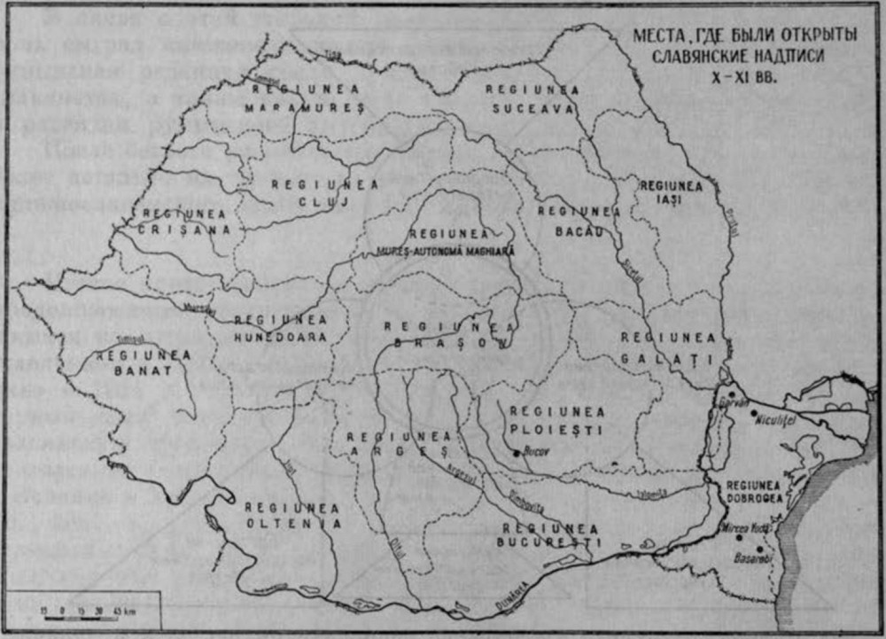 2) В последнее время был открыт ряд надписей, относящихся к X—XI вв., которые полностью подтверждают предыдущий тезис: это так называемая Добруджанская надпись 943 г., обнаруженная в с. Мирча-Вода (Mircea Vodă) [2], надписи на стенах небольшой церкви, открытой в меловой горе в с. Басарабь (Basarabi — Добруджанская обл.) [3], а также фрагментарные надписи, найденные в селе Буков (Bucov), Плоештской области [4], в с. Гарван (Garvăn — район Мачин) и в с. Никулнцел (Niculiţel — район Тулча) [5]. Как можно наблюдать на карте, эти надписи