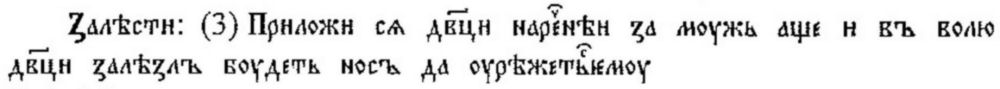 [ЗСЛ, гл. И (13), 37]. [5] К. А. Максимович определил значение глагола как ‘совершить (дерзость), осмелиться (на что-л.)’, указав на отсутствие точного греческого соответствия [2005, 133]. С ссылкой на Ф. Котта [V, 135] приведено чеш. zalézt (i) разг. ‘придраться, взъесться (на кого-л.)’, якобы наиболее близкое к идее ‘дерзости’. Данное толкование неверно, потому что оно игнорирует контекст; выходит, текст следует перевести так: “совершил (дерзость) в волю (или “по воле”) девицы” (глагол осмелиться вообще не вписывается сюда). Другое толкование залѣсти дает СДЯ [III, 324] - ‘вступить в половые отношения’ [6]. Более точное объяснение контексту дает И. И. Срезневский [I, 927] - ‘хотя бы и по воле девицы имел с нею совокупление’. Такой перевод дает и В. Ганев [1959, 370]. Авторы СДЯ в случае просто повторили толкование СлРЯ XI-XVII вв. [5, 231]. Это единственное подобное употребление залѣсти , известное из письменных памятников. Идея К. А. Максимовича о дерзости не увязывается