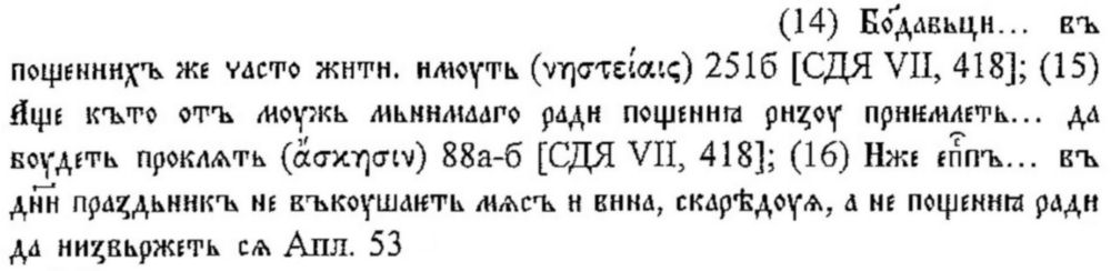 [21] [Срезневский II, 1337]. Относительно (14) и (16) словари для слова пощениѥ определяют значение ‘воздержание от пищи, пост’, а в (15) выделяют значение ‘аскетический образ жизни, подвижничество’. Отнесение слова пость и его производных к моравизмам неосновательно.