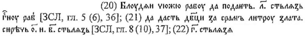 5. При цитировании ссылаемся на издание М. Н. Тихомирова и Л. В. Милова [ЗСЛ], цитируя чаще всего Новгородский список 1280 г. с указанием общепринятого разделения на главы и страницы в издании: номер главы в соответствующем списке дается в круглых скобках. К. А. Максимович использует издание Й.Вашицы [Zakonъ soudnyi ljudьmъ = Soudni zákoník pro lid. - MM 4, 147-198].