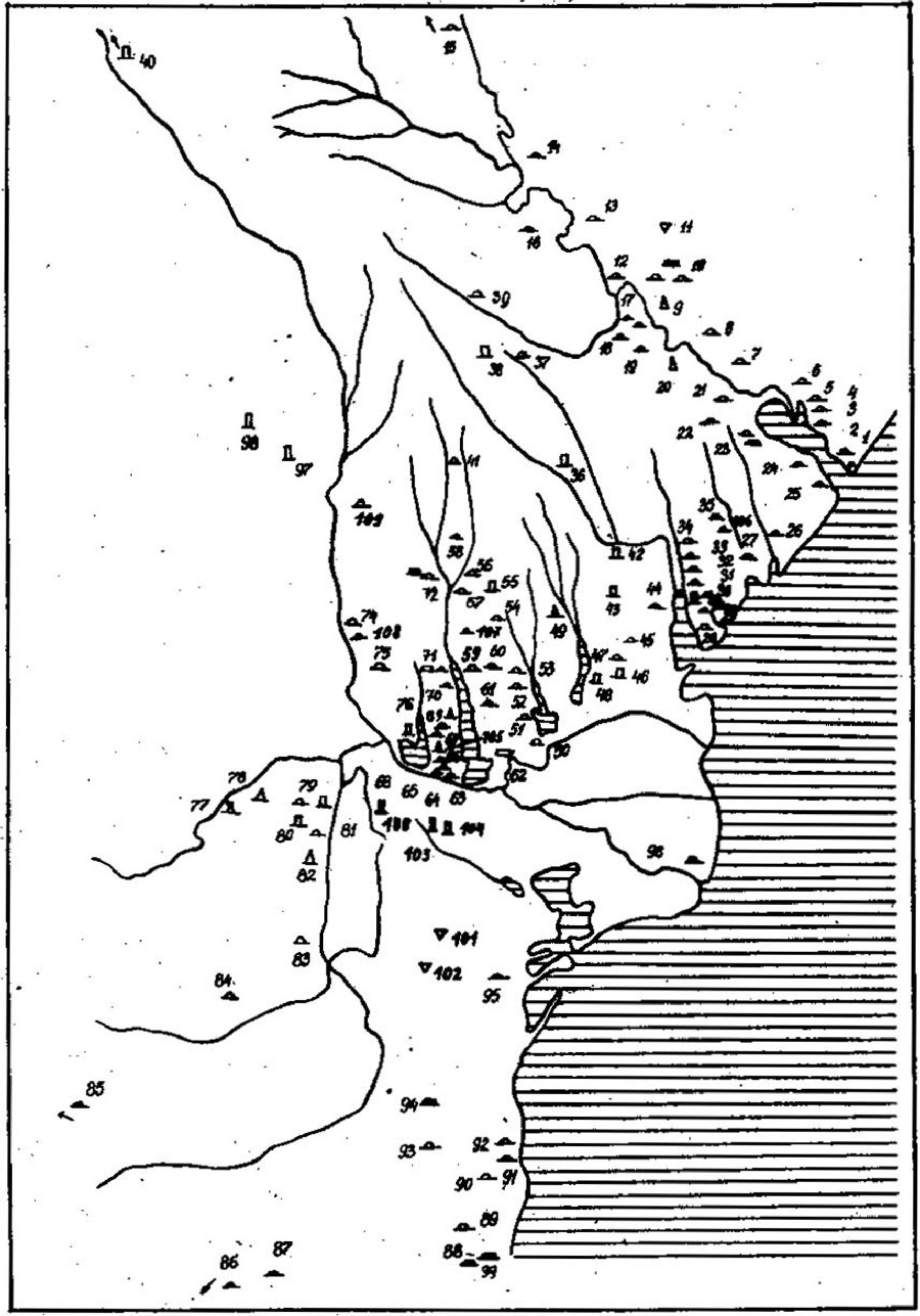 1 — Плавни, к. 28; 2 — Курчи II, к. 25; 3 — Чауш, к. 18; 4 — Нагорное, к. 11; 5 — Кочковатое, к. 48; 6 — Дивизия; к. 20.