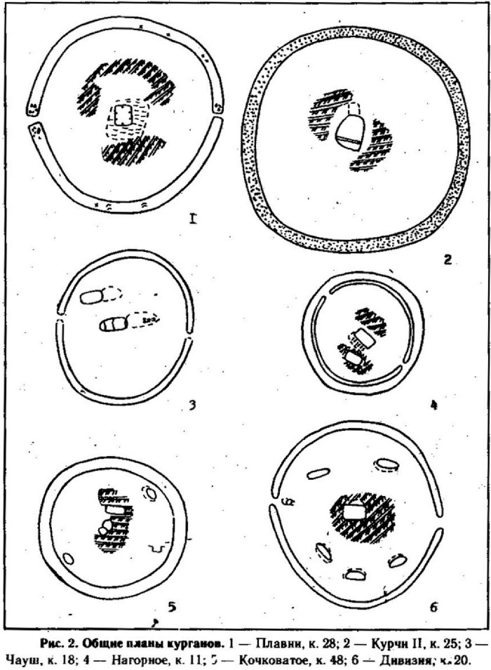 Насыпи курганов (и одиночных, и входящих в состав могильников) обычно земляные и почти не выделяются в рельефе или имеют высоту до 0, 5 м. Редкие курганы возвышались на 1 - 1,5 м (Борисовка, 10; Плавни, 28; Заря, 1 и др.). Из их числа резко выделяется могильник у с. Балабаны, где высота насыпей варьировала от 1,5 до 5 м. Каменные конструкции типа кромлеха или крепиды отмечены только в единичных случаях (Семеновка, 15, 16, 23; Кочковатое, 48; Курчи II, 25 — рис. 2, 2; Мреснота Могила, 3 и др.). Необычная конструкция из овального в плане кромлеха и углубленной грунтовой оградки П-образной формы, окаймляющих погребение, отмечена в кургане 1 группы Хаджидер. Насыпи обычно окружались рвом, в разрезе овальной или прямоугольной формы. Наличие двух рвов отмечено только в кургане 22 у с. Семеновка.