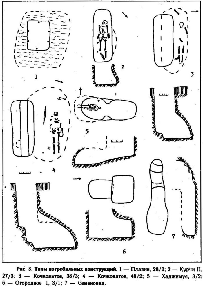 Некоторые отличия наблюдаются и внутри каждого типа погребальных сооружений. Простые ямы прямоугольной или овальной формы, ориентированы в широтном направлении. Размеры их варьируют от 1,2 х 0,2 до 3,2 х 3 м. Преобладают ямы средних размеров. Часто отмечено расширение ям ко дну с одной или со всех сторон, в результате чего параметры могилы по дну резко увеличиваются (рис. 3,2). В редких случаях отмечены деревянные перекрытия (Семеновка, 23/3; Балабаны, 6; Нагорное, 11/2) или каменные заклады (Хаджимус, 5; Хаджидер, 3; Курчи II, 27).