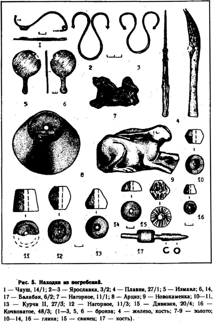 1 — Чауш, 14/1; 2—3 — Ярославка, 3/2; 4 — Плавни, 27/1; 5 — Измаил; 6, 14, 17— Балабан, 6/2; 7 — Нагорное, 11/1; 8— Арциз; 9 — Ново каменка; 10—11, 13 — Курчи II, 27/3; 12 — Нагорное, 11/3; 15 — Дивизия, 20/4; 16 — Кочковатое, 48/3; (1—3, 5, 6 — бронза; 4 — железо, кость; 7—9 — золото; 10—14, 16 — глина; 15 — свинец; 17 — кость).