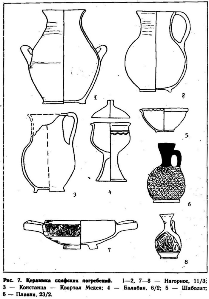 С этими же группами суммарно можно соотнести и большинство находок скифской керамики на поселениях Нижнего Поднестровья и Добруджи.