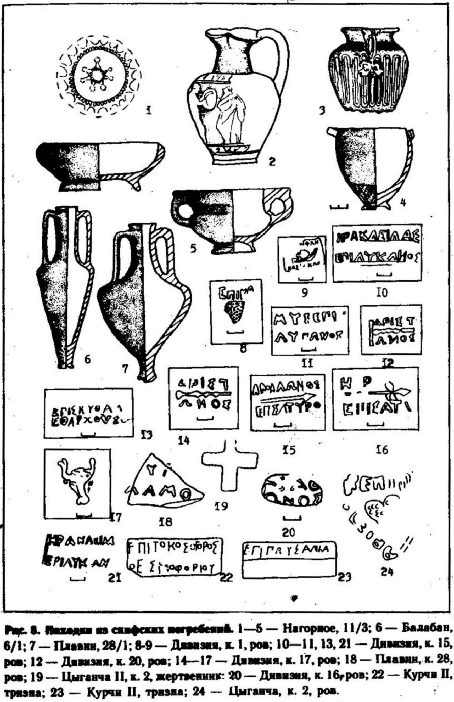 В настоящее время довольно полно, разработана типология амфор, классификация гераклейских и фасосских клейм, в связи с чем данная категория инвентаря приобретает первостепенное значение для уточнения датировки отдельных комплексов. Так, концом V — началом IV в. до н.э. датируется курган 28 у с. Плавни, где найдены амфоры Менды (39, с. 69, рис. 2, 4) и Гераклеи с клеймами I группы (рис. 8, 18) по классификации Б. А. Василенко (49, с. 5, 6; 40, с. 6, 20). Сочетание гераклейских клейм I и III группы (49, с. 6, 7) и фасосского клейма (рис. 8, 8—17, 20, 21) позволяет отнести время существования могильника Дивизия к рубежу I — II четверти IV в. до н.э. Первой половиной IV в. до н.э. датируются могильники Чауш, Плавни I, Измаил, курган Цыганча II (рис. 8, 19, 24) и погребение у с. Островное, где найдены аналогичные гераклейские клейма и фасосские клейма III группы (52, с. 25—34). К концу IV — началу III в. до н.э. относится херсонесская амфора из Констанцы-Суд с двухстрочным клеймом I типа. На основании фрагментов амфор Косса и Родоса и клейм последнего (рис. 8, 22, 23) тризна кургана 20 Семеновского могильника и тризна III могильника Курчи датируются концом III — началом II в. до н.э. (259, р. 529).