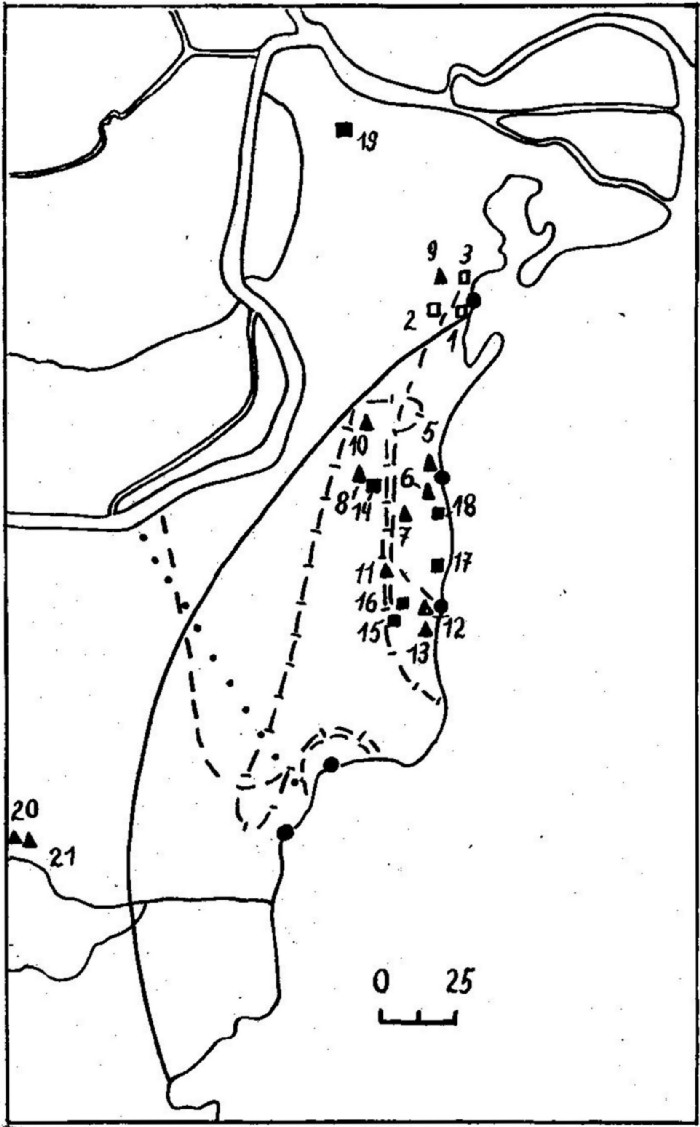 1 — Плавни, к. 28; 2 — Курчи II, к. 25; 3 — Чауш, к. 18; 4 — Нагорное, к. 11; 5 — Кочковатое, к. 48; 6 — Дивизия; к. 20.