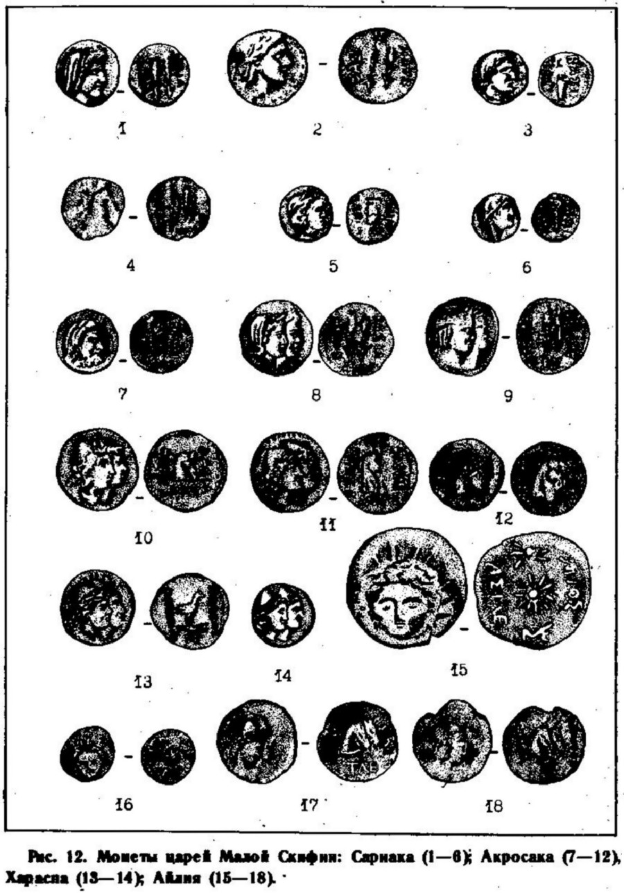 Рис. 12. Монеты царей Малой Скифии: Сариака, Акросака, Хараспа; Айлия
