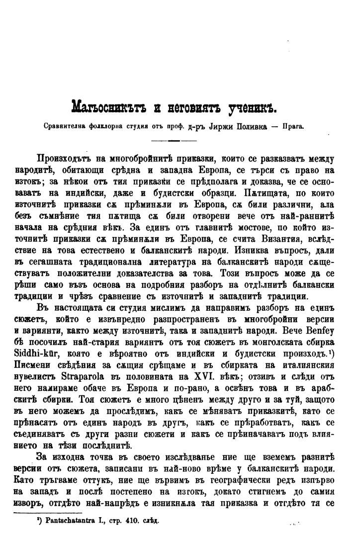 Въ настоящата си студия мислимъ да направимъ разборъ на единъ сюжетъ, който е извънредно разпространенъ въ многобройни версии и вариянти, както между източнитѣ, така и западнитѣ народи. Вече Benfey бѣ посочилъ най-стария вариянтъ отъ тоя сюжетъ въ монголската сбирка Siddhi-kür, която е вѣроятно отъ индийски и будистски произходъ. [1] Писмени свѣдѣния за сѫщия срѣщаме и въ сбирката на италиянския нувелистъ Straparola въ половината на XVI. вѣкъ; отзивъ и слѣди отъ него намираме обаче въ Европа и по-рано, а освѣнъ това и въ арабскитѣ сбирки. Тоя сюжетъ е много цѣненъ между друго и за туй, защото въ него можемъ да прослѣдимъ, какъ се мѣняватъ приказкитѣ, като се прѣнасятъ отъ единъ народъ въ другъ, какъ се прѣработватъ, какъ се съединяватъ съ други разни сюжети и какъ се прѣиначаватъ подъ влиянието на тѣзи послѣднитѣ.