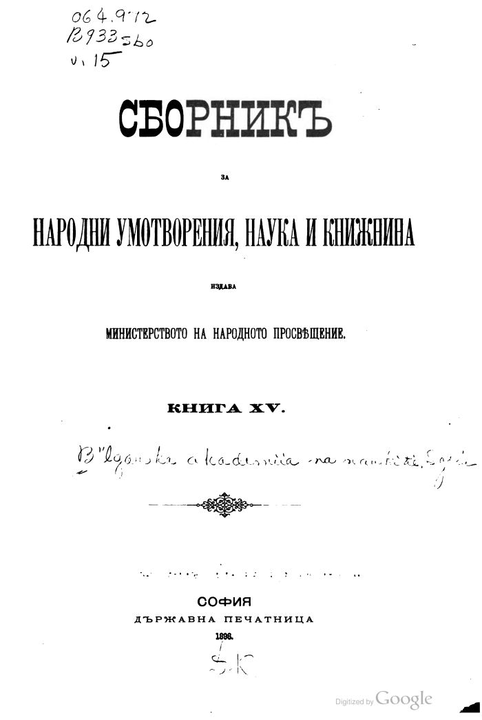 Сборникъ за Народни Умотворения, Наука и Книжнина, Книга XV, 393-448 Сканове в .pdf формат (6.5 Мб) |