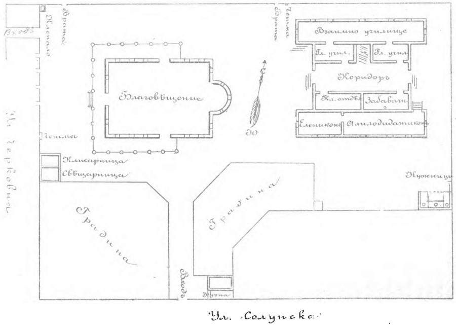 На влизане въ самия градъ улицитѣ изобщо ми се видѣха тѣсни и криви. Тѣ бѣха обградени съ кѫщи повечето на единъ етажъ, направени отъ камъкъ, плитари (непечени тухли) и измазани съ глина, рѣдко прошерени съ дво-етажни кѫщи, измазани съ варъ и боя. По дѣцата се познаваше, че бѣ турската махала. Подиръ десетина минути, като изминахме мехкемето и банята, слѣдъ като изходихме нѣколко кални и прашни улици, стигнахме до площадьта при часовника, която бѣ прѣпълнена отъ движеще се множество. Тукъ другаритѣ ми се отбиха по ханищата, а мене отправиха съ едно момче за училището. Минахме моста, който отдѣля чаршията Галата отъ града, и слѣдъ малко стигнахме прѣдъ едни голѣми порти. Момчето, като ми посочи училището, върна се, а азъ слѣзохъ отъ коня, поведохъ го прѣзъ широкия църковенъ дворъ и го вързахъ за единъ отъ дерецитѣ, които сѫ прѣдъ училището и подпиратъ частъ отъ горния му етажъ.