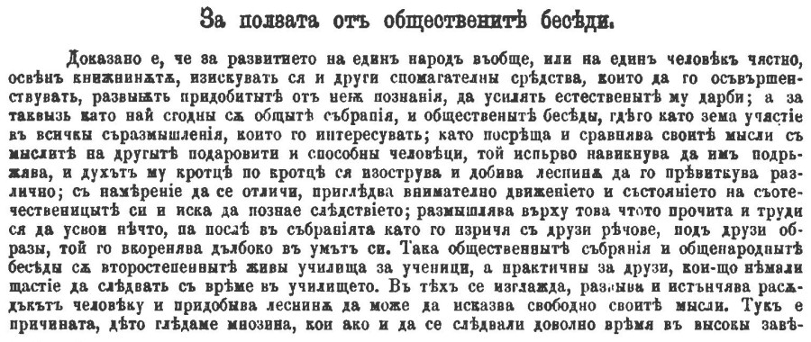 че само съ съединени сили и задружно работене тѣ лесно могатъ да оборватѣ народнитѣ си неприятели, да правятъ чудеса и най-послѣ скѫпо да цѣнятъ общественитѣ си заведения и внимателно да са грижатъ да ги уреждатъ. Драго ти бѣше, като гледашъ ония ми ти бакали, ония ми ти казанджии, които до вчера никакъ не ги интересуваха народнитѣ работи, какъ редовно се събираха въ общината, какъ мирно и тихо разсѫждаваха да рѣшатъ по-справедливо нѣкои сѣмейни разпри, дори и нѣкои спорове, които имаха граждански и търговски характеръ и пр. Намираха се обаче измежду нихъ и нѣкои себелюбиви личности, останки отъ прѣжнитѣ чорбаджии, които бѣха видѣли или и въ съдружие съ владицитѣ бѣха вършили безконтролно разни несправедливости. Тѣ гледаха съ криво око на общината и читалището, защото имъ прѣчеха да поразполагатъ самоволно съ общественитѣ работи и по волята си да боравятъ въ общината.