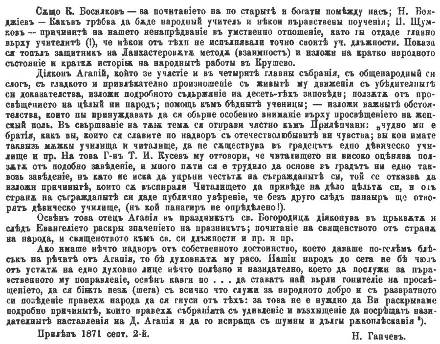 Когато свършихъ, всички присѫтствуещи си подадоха рѫка за опрощеяие, и работитѣ въ обществото си тръгнаха по прѣжному. Само злобната оная дружинка, която възбуди врѫждата, не се примири, а все продължаваще да разѣжда народното тѣло. [1]