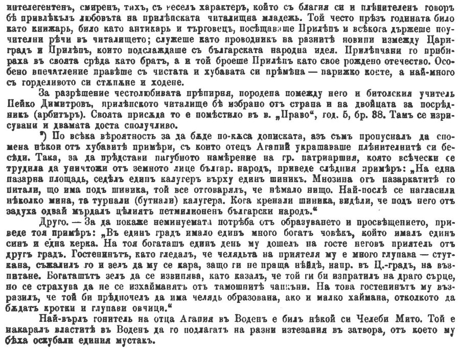 удивлението на подпрѣдседатвля, Мирче Бомболъ, [1] когато на второто заседание секретарьтъ прочете протокола отъ първото заседание и когато слушаше въ него да стои буквално забѣлѣженъ сѫщинскиятъ неговъ насмѣшливъ говоръ. „Ефендимъ, ефендимъ, па бива ли вака да се пишуетъ! Овдѣ сте писали и търло (ягълъ, кошара за овце) и удка (кукумявка), и . . . . ., и . . . . ." Думата търло той я употрѣбяваше въ прѣносенъ смисълъ. Съ нея той подиграваше Димка Ачковъ, който носѣше на главата си шубара, завита съ черно платно, като гѫжва, наричаше го още и улище (пчелникъ); а думата утка употрѣбяваше, когато искаше да покаже, че нѣкой е съвсѣмъ извѣянъ. Записването сѫщинскитѣ думи въ протокола стана причина, та членоветѣ отъ общината да говорятъ по-прибрано. На другата година (1872) стана нужда да се изпраща повторно депутатъ въ Цариградъ за избирането първия български екзархъ. Сега изборътъ бѣ безспоренъ, избра се и се изпрати пакъ Т. Ив. Кусевъ, а секретарската длъжность въ общината зае пакъ Ил. Здравевъ, съ което се даде възможность на интриганската дружина отново да вдигне глава. Захванаха да интригуватъ прѣдъ общината, че мисията на Кусевото депутатство въ Цариградъ слѣдъ избирането и утвърждаването на българския екзархъ е вече свършена, та трѣба да се завърне; и тава направиха общината да му прѣсѣче ничтожната подръжка, която му изпращаше до тогава. Кусевъ писа много пѫти на общината, че при все че се е избралъ български екзархъ, но докато да се добие нужното разрѣшение и пелагонийската епархия да има свой български владика, има се нужда още отъ човѣкъ, който да работи за това. Като видѣ, че не го послушаха съотечественицитѣ му, принуди се самъ да се обдържа, като се услови за български учитель въ Айналѫ-чешме въ Цариградъ. На другата година слѣдъ изпитанието Кусевъ се рѫкоположи отъ пловдивския митрополитъ г-нъ Панаретъ за дияконъ при пловдивската митрополия подъ името Методий, послѣ за протосингелъ и архимандритъ, и днесъ изпълнява длъжностьта ст.-загорски митрополитъ.