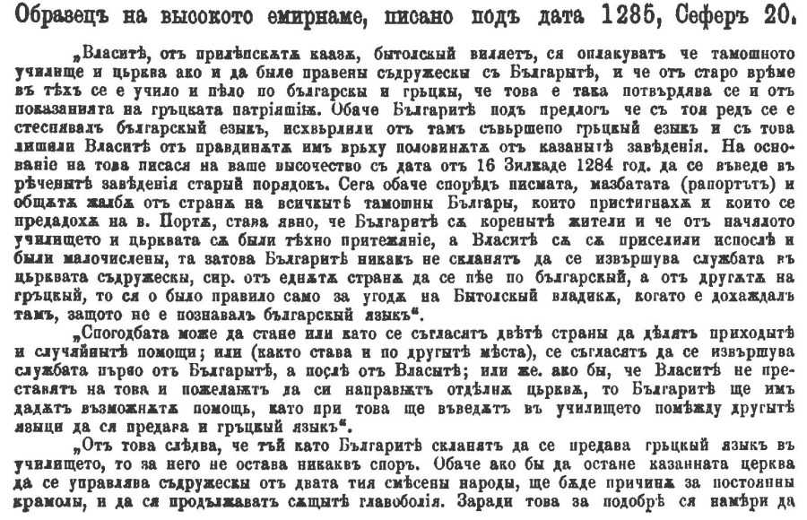 отъ дѣсната, и се смутиха, като гледаха, че тамъ е вече пълно съ българи, нѣкаква магическа сила за малко врѣме бѣ изпълнила черковата съ български богомолци. Тоше Яръмъ Зерде, безъ да обръща внимание на разправията, която ставаше въ черковата, слѣдваше да отговаря на свещенослужителя отъ лѣвата страна. Власитѣ, смутени и посрамени, събраха си книгитѣ и си излѣзоха отъ черкова. Разпрата се прѣнесе отново прѣдъ правителството. Власитѣ, основани на патрияршеското послание, искаха да имъ се отстѫпи непрѣмѣнно дѣсната страна отъ черковата, и въ тѣхното училище да има и за напрѣдъ по двоица гръцки учители, подържани отъ черковнитѣ приходи. Българитѣ възражаваха, че тѣ не могатъ да взиматъ въ внимание патриаршескитѣ заповѣди, защото не припознаватъ патриаршията, а искатъ да се изпълни буквално ирадето само за черковата, а колкото за училището, тѣ настояваха на първитѣ си заявления, сир. училищата да бѫдатъ общи и за двата народа, въ отдѣленията да се прѣдава на разбираемия български езикъ, а гръцки да се прѣдава само въ класоветѣ като езикъ, и то задължително за всички ученици безъ разлика на народность. Мютесарифътъ, като видѣ, че власитѣ не прииматъ това хубаво и разумно прѣдложение на българитѣ, и че за напрѣдъ не ще има съгласие помежду тия два народа, изпърво направи прѣдложение, въ черквата да служатъ първо българитѣ, а подиръ тѣхъ власитѣ. Власитѣ изпърво приеха това прѣдложение, но когато българитѣ имъ заявиха, че слѣдъ черковния отпускъ тѣ ще прибератъ отъ черковата свѣщитѣ, дору и маслото отъ кандилата, тѣ го отхвърлиха. Тогава мютесарифътъ прѣдстави ново прѣдложение: българитѣ да броятъ на власитѣ 400.000 гр. за възнаграждение, дѣто и тѣ сѫ спомагали при направата въ черковата и училищата. Българитѣ не приеха и това прѣдложепие, а се обѣщаха да помагатъ кой съ каквото си ще. Подиръ нѣколкодневни подобни разправии, мютесарифътъ, като видѣ, че не ще може да се дойде до никакво съглашение, отиде си въ Битоля. Сега се захващатъ и отъ двѣтѣ страни нови прошения, нови депутации за въ Цариградъ, отдѣто се донесе новъ ферманъ, съдържанието на който се намира въ слѣдната дописка, помѣстена въ в. „Македония" год. II бр. 32 отъ 6-и юлия 1868 год.