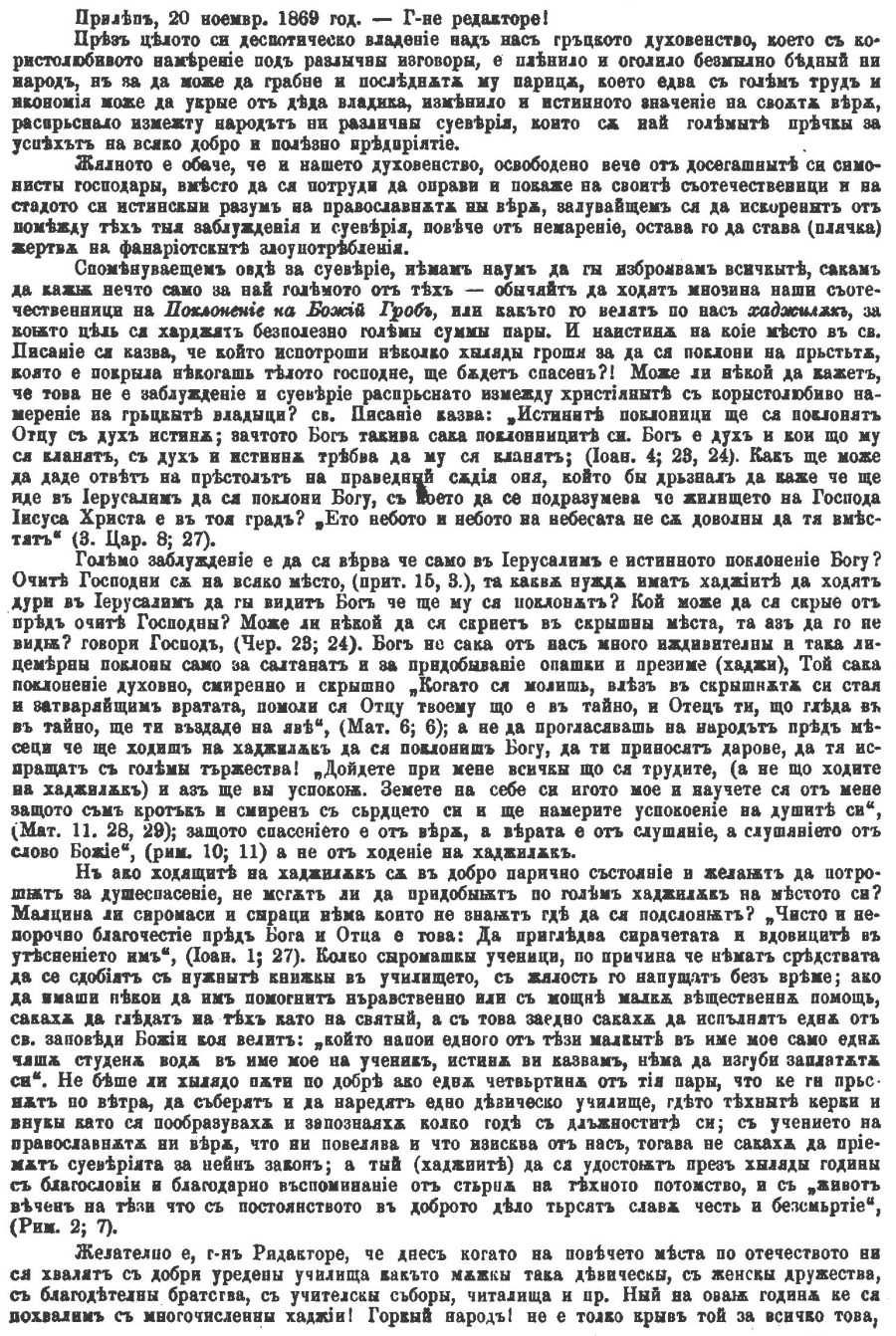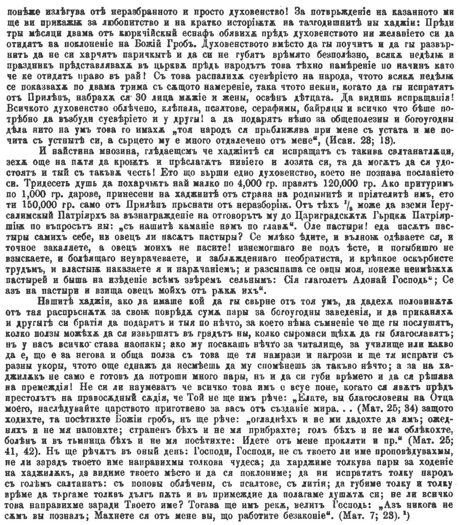 Всѣкой отъ васъ много лесно може да си прѣдстави несносното положение, въ което се намѣриха по неволя пашитѣ хаджии. На врѣмето не е имало кой да ги поучи и отвърне отъ суетното имъ намѣрение, да ходятъ на хаджилъкъ, напротивъ сѫ се намирали чловѣци, които нарочно сѫ ги подбуждали на това, като имъ се казвали, че ако отидатъ въ Иерусалимъ, тѣ освѣнъ дѣто ще придобиятъ богуугодното име хаджи, но ще се сдобиятъ съ ферманъ, който ще ги отведе право въ рая; и они за да се сдобиятъ съ всички тия блага, сѫ си дали и кальта отъ подъ ноктето. А ние сега освѣнъ че по вѣстницитѣ ги нападаме и укоряваме, но имъ се присмиваме и въ читалището и по чаршията и постоянно имъ въвираме въ очи, че тѣ съ своето ходене на хаджилъкъ сѫ направили най-голѣмата глупость. Естествено е, че всѣкой, който и да билъ той, ще се докачи и ще поиска да си отмъсти противъ лицето или заведенето, отъ което излизатъ тия докачения и оскръбения. (Буйни и продължителни рѫкоплѣскания. Лицата на хаджиитѣ и тѣхнитѣ послѣдователи свѣтнаха).