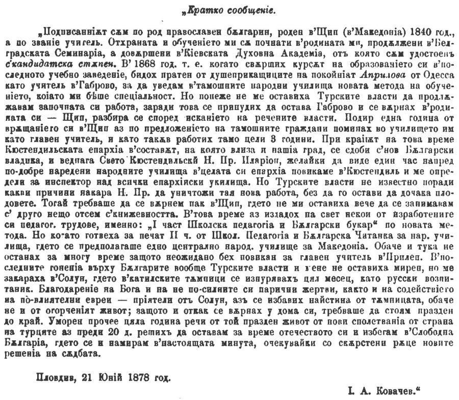 или на магазата на българофила Авраамъ Нахмиясъ. Слѣдъ два деня научихъ се, че Александъръ много ме дирилъ, за да му прѣведа на български нѣкакво турско писмо. Азъ се оставихъ да ме намѣри. Той ми каза, че правителството му възложило да намѣри нѣкой българинъ, да прѣведе на български нѣкакво си правителствено писмо, и понеже знае, че съмъ въ Солунъ и можа да свърша тая работа, замоли ме да отидемъ до виляетския конакъ. По физиономията и по начина на говора, познаваше се, че Александъръ не хитруваше. Тръгнахме за конака, дѣто ме прѣдстави и прѣпорѫчи на единъ чиновникъ, който слѣдъ като ми посочи столъ да седна, излѣзе заедно съ Александра. Подиръ малко се завърнаха и ми казаха, че муавининътъ (помощникъ на валията) иска да ме види. Муавининътъ бѣ Костаки ефеиди, който ме познаваше отъ Прилѣпъ, дѣто бѣ дохождалъ съ солунския валия Сабри паша. Той ме прие много ласкаво и слѣдъ като ми почерпи съ кахве и цигара, каза ми, че било нужно да се прѣведе на български едно обявление, съ което се извѣстява на населението, че Солунскиятъ виляетъ, въ който тогава влизаше и Битолскиятъ санджакъ, се обявява въ военно положение, и ми каза, че долѣ въ канцеларията на печатницата ще намѣря удобно мѣсто за писане, па издаде и нужната заповѣдь за това чрѣзъ единъ прислужникъ до управителя на печатницата. Когато се отлитографираха достаточно екземпляри отъ тоя прѣводъ, азъ взехъ единъ екземпляръ и приключенъ въ писмо го изпроводихъ Ковачеву, като му пишехъ, че не ще стори злѣ, ако и той дойдѣше въ Солунъ.