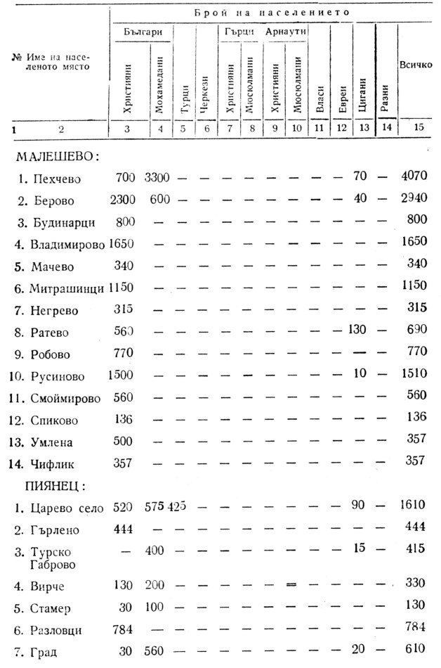 В началото на 1899 г. Стефан Веркович издава подробни статистически сведения за броя на населението в някои околии на Македония, в т. ч. и за Малешевско-Пиянечкия край. Но неговата статистика е била правена по стари данни и може би затова една голяма част от селата, влизащи в състава на Малешевска кааза са причислени от Веркович към Кюстендилската кааза, дето те са спадали преди Освободителната война. Най-достоверни статистически данни за броя на населението в Малешевско-Пиянечкия край през 90-те години на миналия век ни дава Васил Кънчов. Според неговите данни броят на населението в Малешевска кааза е бил следният: