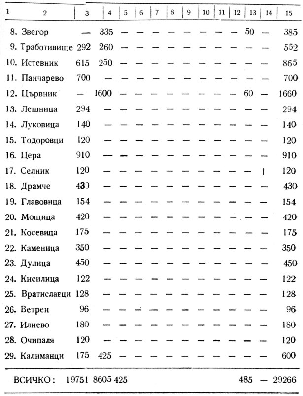 [[ 8. Звегор, 9. Тработивище, 10. Истевник, 11. Панчарево, 12. Цървник, 13. Лешница, 14. Луковица, 15. Тодоровци, 16. Цера, 17. Селник, 18. Драмче, 19. Главовица, 20. Мощица, 21. Косевица, 22. Каменица, 23. Дулица, 24. Кисилица, 25. Вратиславци, 26. Ветрен, 27. Илиево, 28. Очипаля, 29. Калиманци ]]