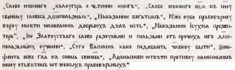 „За милостивия човек, подир когото ходели сиромасите“, „За търговеца, обещал милостиня на бедняка“, „За отшелника Ефрем“, „Божието правосъдие“), извлечени от Пролога. При това книжовникът изменя езика и стила на текстовете, внася интересни промени в съдържан ието :