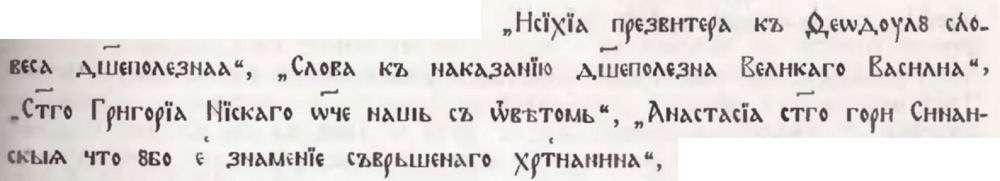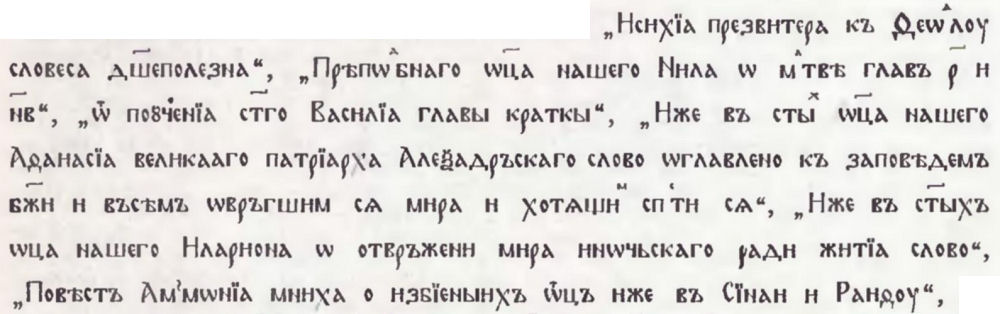 11. Намира се в Москва, ГИМ, Синод. № 551. Издаден е през 1967 г. — Синайский патерик.