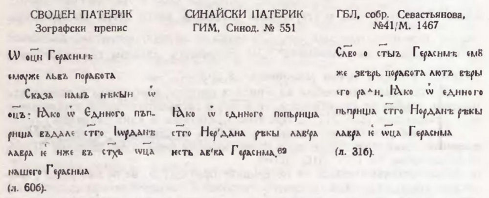 двете части са били обединени пак от руски книжовници. [22] Преписването само на един патеричен разказ може да се счита по-скоро начало на процеса, при който към Пролога започват да се присъединяват нови произведения, отколкото резултат от извличането само на този разказ от обогатения вече Пролог. При това интересно е да се отбележи, че „Герасим и лъвът“ не е поставен в края на Пролога, а при проложните жития, които се четат на четвърти март. На същото място той се намира обикновено и в по-късните преписи на Пролога, където е използувана и същата редакция на текста му.