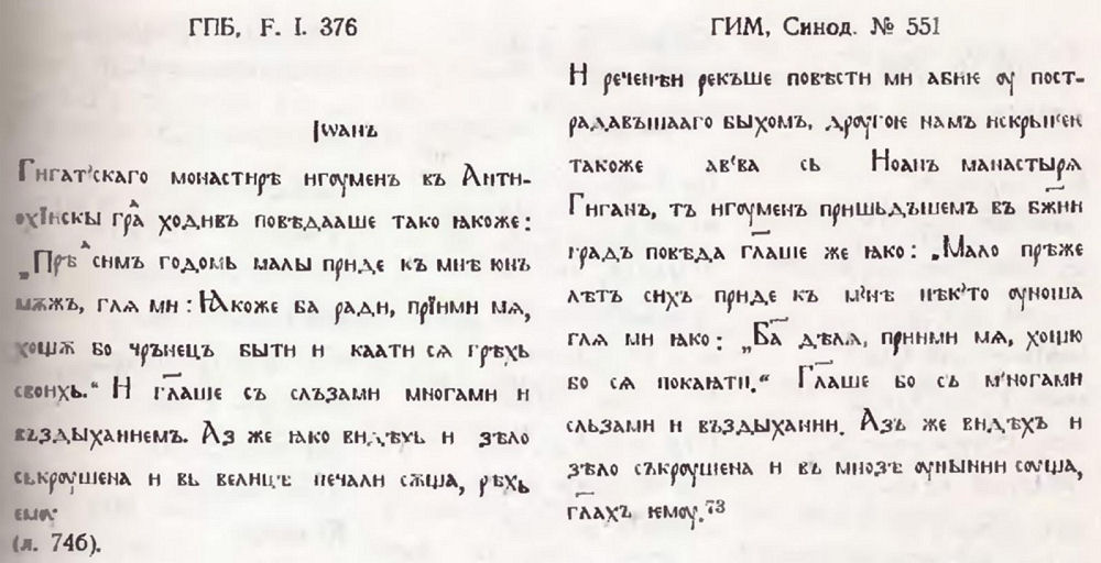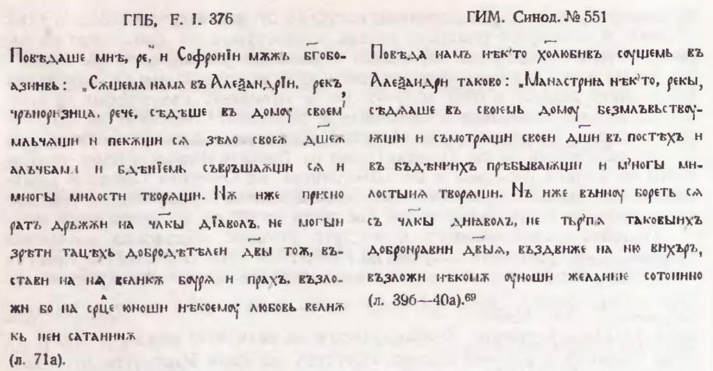 3. C. Северьянов. Супрасльская рукопись. T. I. СПб. 1904, с. 168—174. Новобългарски превод на този разказ вж. в Лавсаик или животопис на св. отци от преподобний Паладия епископ Еленополски. С. 1939, с.59—62.