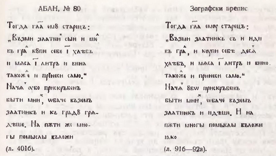 От съпоставката му с текста на запазения препис от XI в., [16] става ясно, че в Берлинския сборник разказът е значително преработен. Промените в Берлинския сборник не се отраничават с частички изменения в някои детайли, а засягат цялостната структура на произведението, основни моменти от съдържанието му. По-старият текст е насочен към прослава на християнската религия, като се утвърждава мисълта, че спазването на нейните морални норми винаги бива възнаградено, особено в труден момент. В другия случай стремежът е единствено да се внуши на богатите, че е необходимо да се раздава милостиня, като се правят всички усилия да се подчертае колко големи печалби ще им донесе това. Именно от същественото изменяне на идейната насоченост на творбата, за което, разбира се, има предпоставки в нейния текст, произтичат и преобразованията, направени в Берлинския сборник. Семейството на християнката и езичника вече не е бедно, напротив, „богатьствоу его не бѣ коньца“. Ето защо раздаването на милостиня е мотивирано по съвсем друг начин. Докато в първия случай нуждата подтиква бедняците да дадат парите си в заем, та да припечелят нещо, и тогава жената убеждава съпруга си да ги дадат чрез просяците на християнския бог, във втория мъжът просто започва да раздава имуществото си като милостиня.