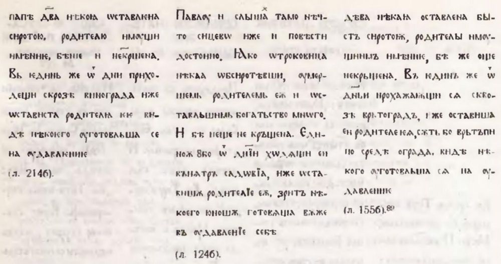 Освен това преписаните тук жития на Йоан Мълчаливи и Яков Черноризец съдържат някои епизоди, които по форма и съдържание наподобяват извънредно много патеричните разкази. [5] Интересно е по какъв път разказът за Павел Препростия е достигнал до Супрасълския сборник. Сигурно е, че той не е извлечен от пълен славянски превод на Лавсаика, понеже гръцките текстове на този патерик представят съвършено различна редакция на текста, [6] а освен това няма никакви следи от цялостен старобългарски превод на Лавсаика. Възможно е книжовникът да си е послужил с Египетския патерик, тъй като в него се съдържа тази глава от Лавсаика. Но най-вероятно разказът е бил преведен самостоятелно заедно с други произведения, съдържащи се в някой гръцки сборник със смесено съдържание, и оттук е преминавал в състава на новопреписваните български сборници.